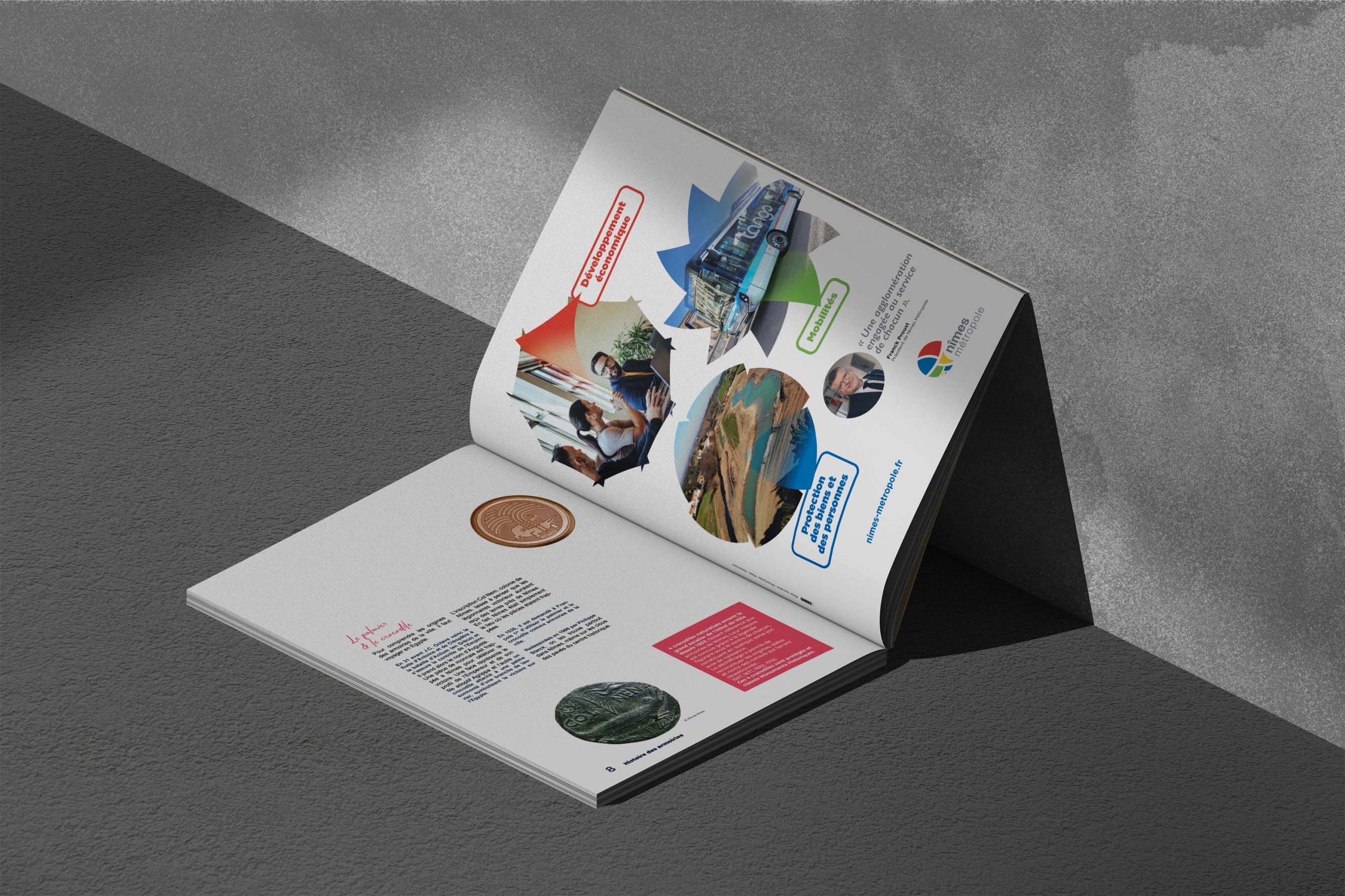 - Nous avons conçu un visuel synthétique, dynamique et lisible, où chaque pilier est mis en scène dans une forme inspirée du logo de Nîmes Métropole, assurant ainsi une parfaite cohérence graphique. Les univers visuels choisis incarnent concrètement l’action publique au service du quotidien des habitants. Ce visuel constitue désormais une vitrine identitaire forte pour l’Agglo, adaptable à de nombreux supports de communication.