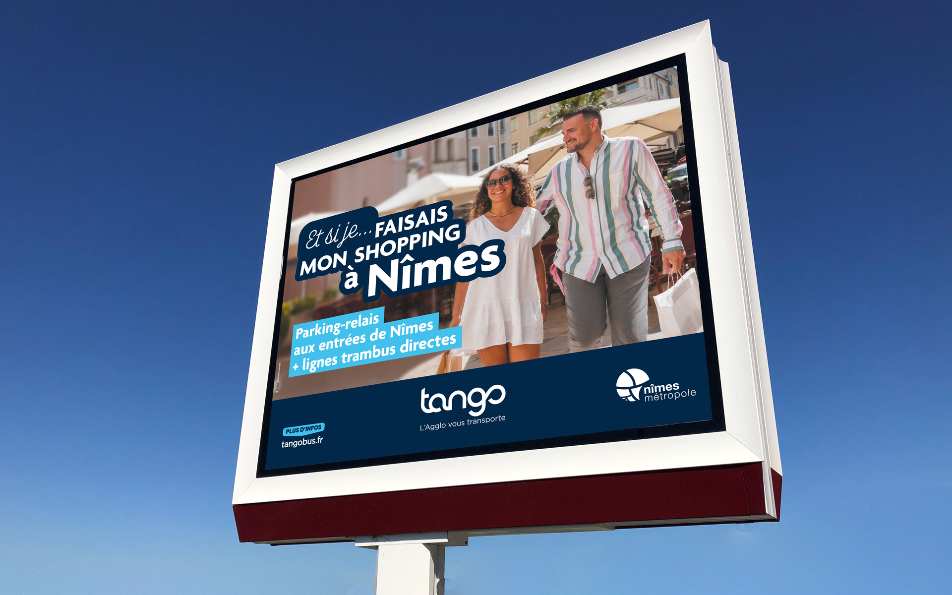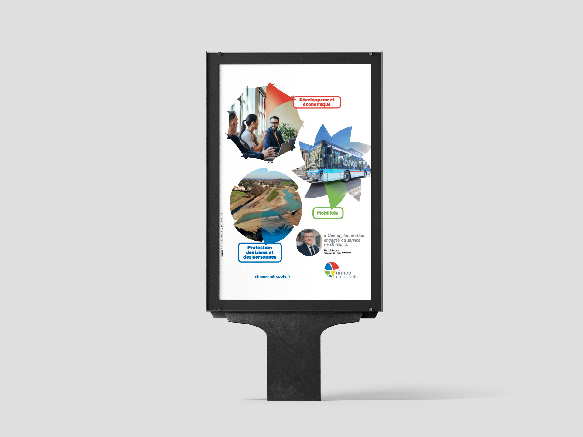 - Nîmes Métropole souhaitait disposer d’un visuel générique et emblématique, capable d’incarner l’essence de ses missions dans une communication institutionnelle à destination du grand public comme des relais d’opinion régionaux et nationaux. L’objectif : valoriser les trois grands piliers de l’agglomération – le développement économique, les mobilités, et la protection des biens et des personnes – dans un message clair, positif et percutant. Ce visuel devait être pensé pour une utilisation récurrente dans la presse et d’autres supports de communication.